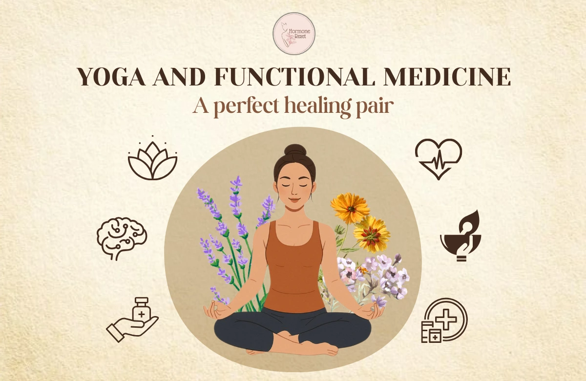 Yoga helps regulate stress, nervous system balance, and hormonal responses, while Functional Medicine identifies and addresses underlying root causes such as inflammation, nutrient deficiencies, gut issues, and hormonal imbalances. Together, they support whole-body healing rather than symptom-only relief.